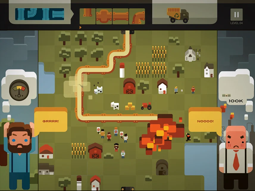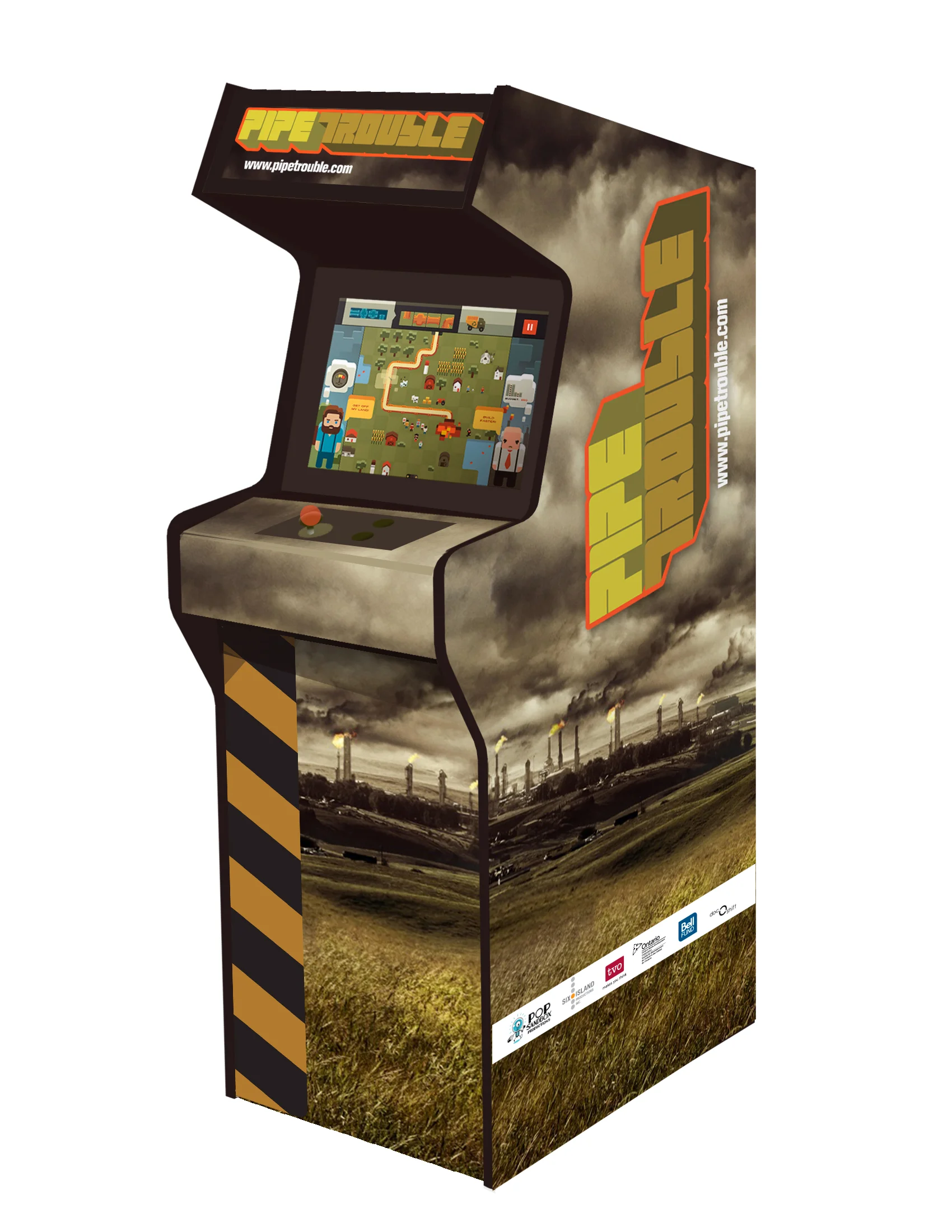 Pipe Trouble is a re-imagining of the classic game Pipe Dreams. It is designed to take players through an exploration of the complexities around energy extraction. The game debuted in a fleet of custom arcade machines at events across Toronto as a companion piece to the indie documentary Trouble in the Peace. However it soon took on a life of its own, igniting debate in the media concerning the role of video games in social commentary.
